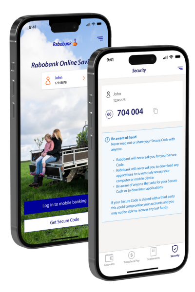 Rabobank Online Savings utilises a Secure Code generator on the mobile app as a multi-factor authentication tool to enhance the security of your account. Once set-up, the Secure Code makes accessing internet banking easy! To learn more, visit our Secure Code webpage.